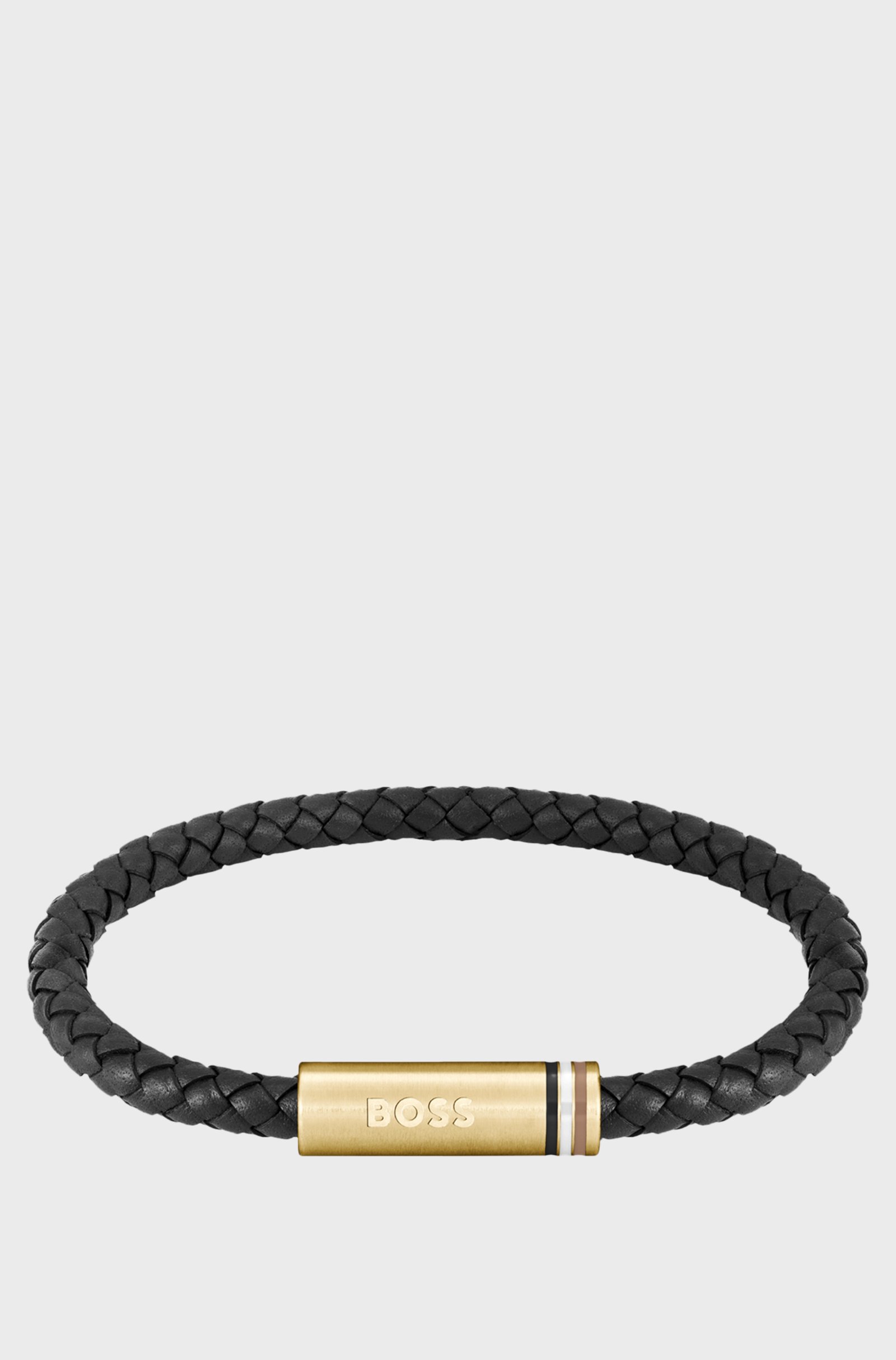 Pulsera hombre en piel trenzada negra con logo BOSS en el cierre geometrico